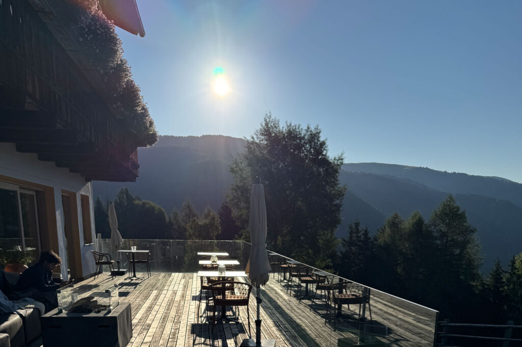 Auf dieser Terrasse praktizieren wir Yoga, genießen danach ein herrliches Frühstück, brechen dann vielleicht zu einer Wanderung in die Bergwelt oder einem Ausflug in nahegelegene Orte wie Brixen oder Brunneck auf oder bleiben einfach im Hotel mit seinem gemütlichen SPA Bereich.